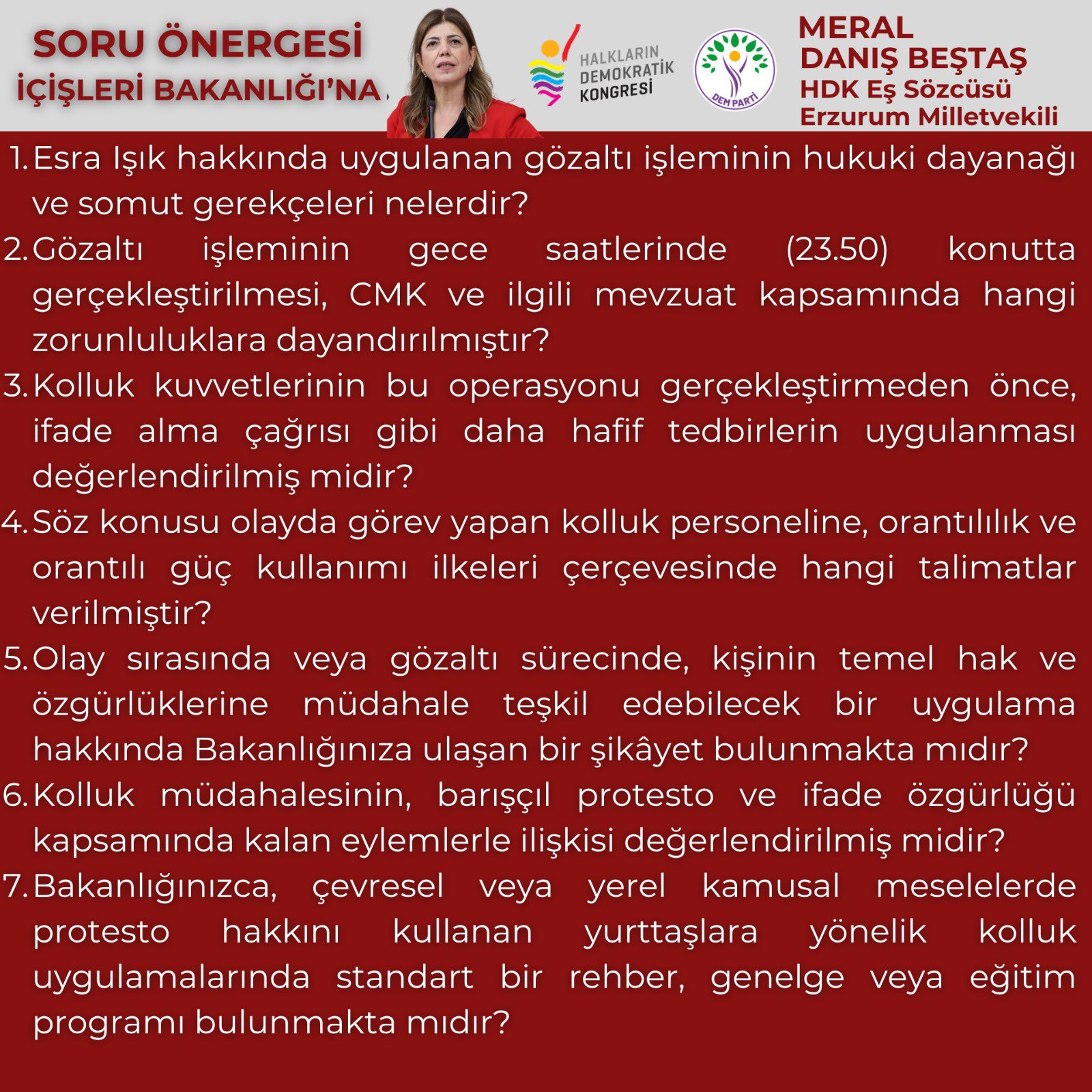 İçişleri Bakanlığı’na sunulan önergede, Esra Işık hakkında uygulanan gözaltı işleminin hukuki dayanağı, gece saatlerinde yapılan operasyonun gerekçesi ve kolluk kuvvetlerinin müdahale sürecindeki uygulamaları sorgulandı. Ayrıca orantılı güç kullanımı, ifade özgürlüğü ve barışçıl protesto hakkı kapsamında yapılan müdahalelerin hukuki çerçevesi hakkında açıklama talep edildi.