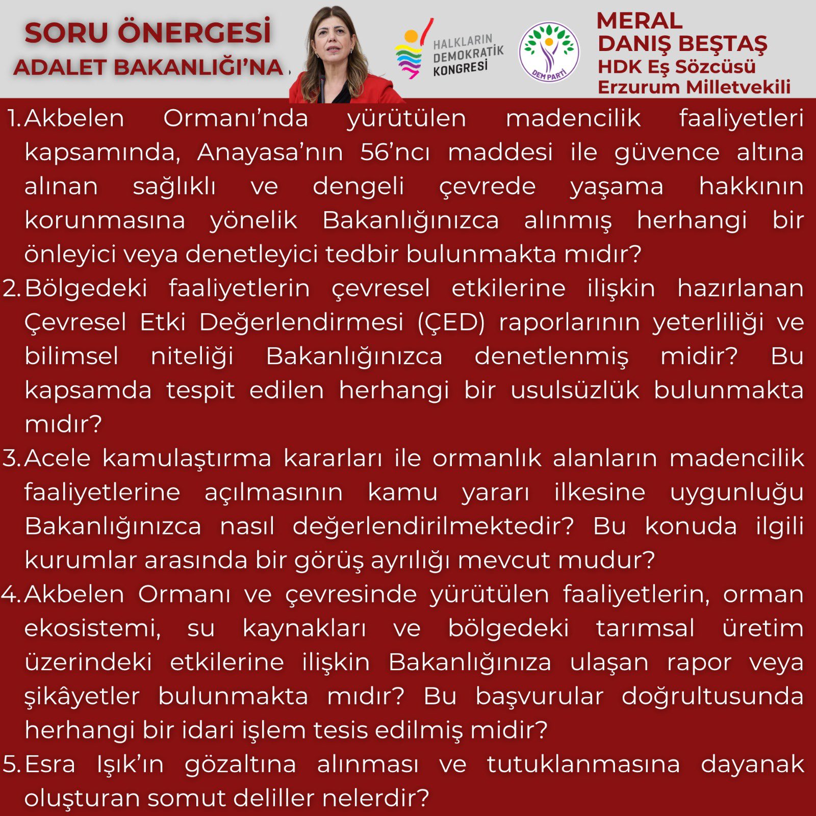⌈AHA⌉ DEM Parti Erzurum Milletvekili ve HDK Eş Sözcüsü Meral Danış Beştaş, Muğla’nın Milas ilçesine bağlı İkizköy’de bulunan Akbelen Ormanı’nda yürütülen madencilik faaliyetleri ve bu süreçte yaşanan gözaltı ve tutuklamalara ilişkin İçişleri ve Adalet Bakanlıklarına soru önergeleri verdi.