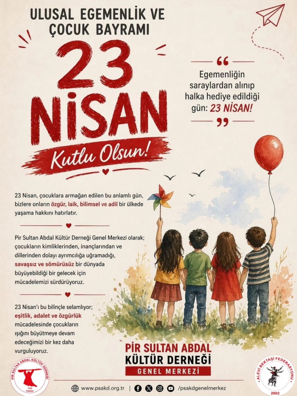 ⌈AHA⌉ Pir Sultan Abdal Kültür Derneği Genel Merkezi, 23 Nisan Ulusal Egemenlik ve Çocuk Bayramı dolayısıyla yazılı bir açıklama yayımladı. Açıklamada, 23 Nisan’ın yalnızca bir bayram değil, halk iradesinin esas alındığı tarihsel bir dönüm noktası olduğu vurgulandı.