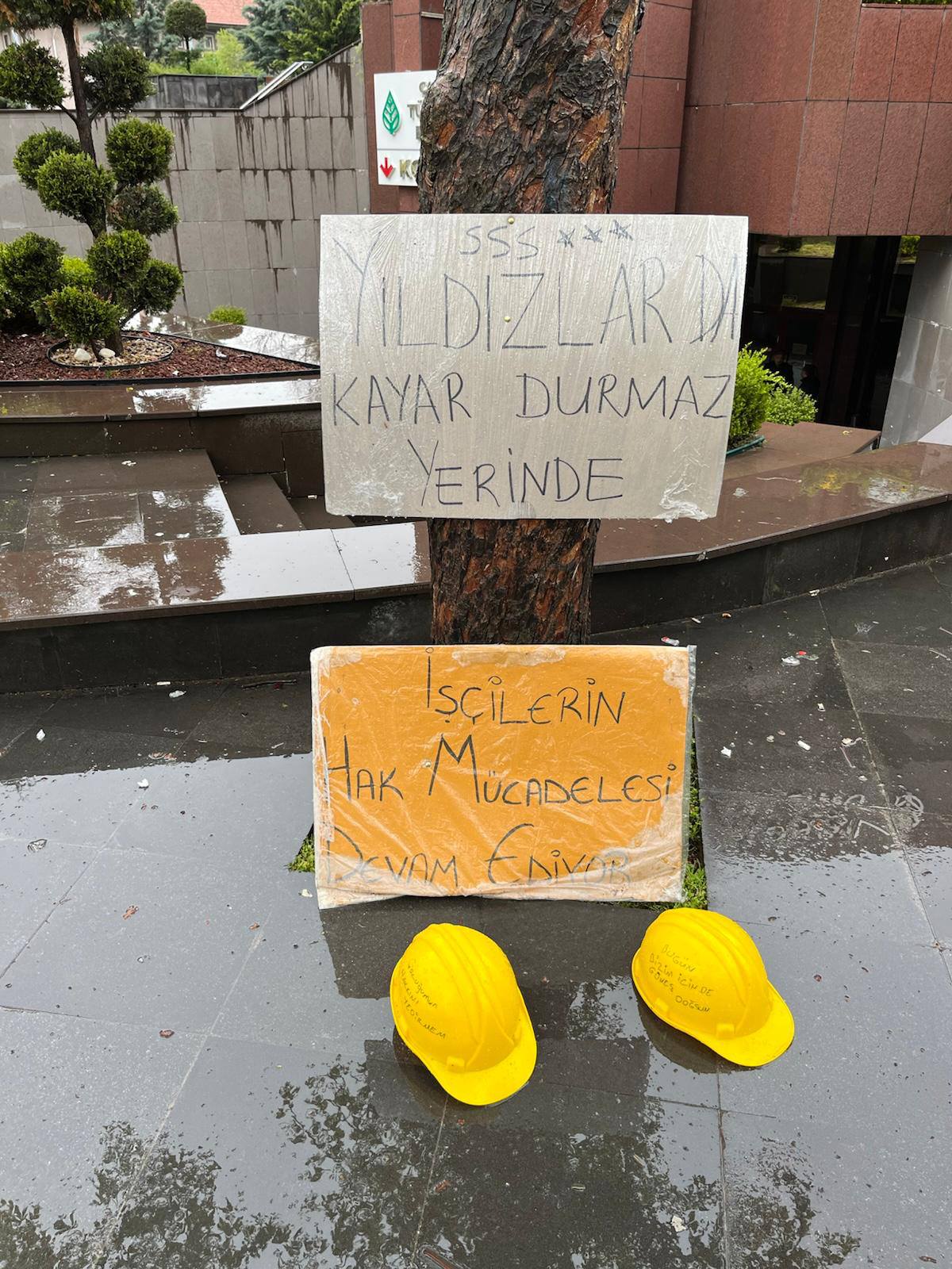 Eylem alanında sergilenen pankartlarda “Yıldızlar kayar durmaz yerinde” ve “İşçilerin hak mücadelesi devam ediyor” ifadeleri dikkat çekti. Sarı baretlerini alana bırakan işçiler, yaşadıkları sorunlara karşı mücadelelerini kararlılıkla sürdürdüklerini vurguladı.