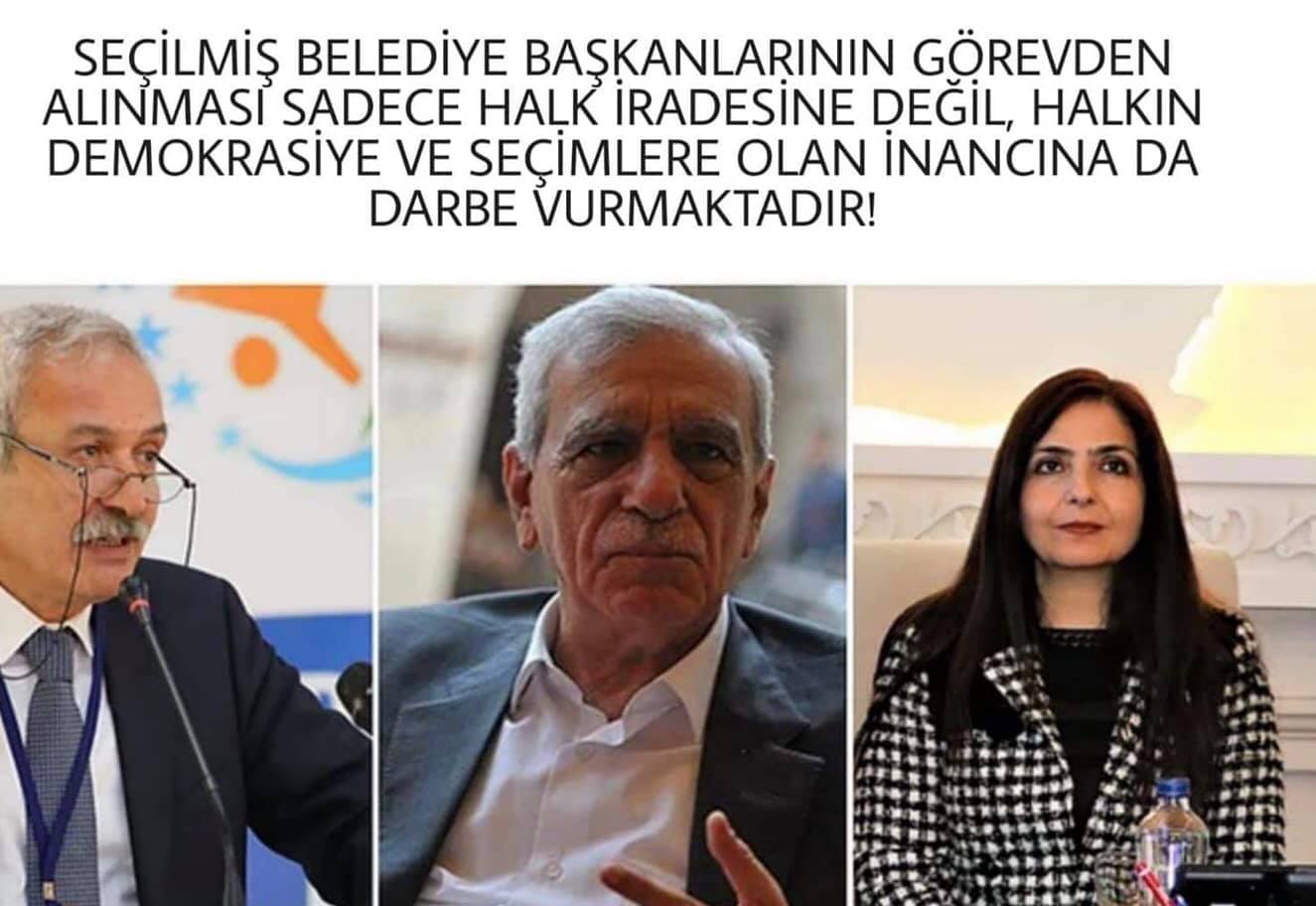Diyarbakır Büyükşehir Belediyesi Eş Başkanı Adnan Selçuk Mızraklı, Mardin Büyükşehir Belediyesi Eş Başkanı Başkanı Ahmet Türk ve Van Büyükşehir Belediyesi Eş Başkanı Bedia Özgökçe Ertan bu sabah İçişleri Bakanı tarafından görevden uzaklaştırıldı. Bakan Soylu, seçilmiş ve halkın iradesini temsil eden belediye başkanlarının yerine Diyarbakır Valisi Hasan Basri Güzeloğlu, Mardin Valisi Mustafa Yaman ve Van Valisi Mehmet Emin Bilmez, belediye başkan vekili olarak görevlendirildi.