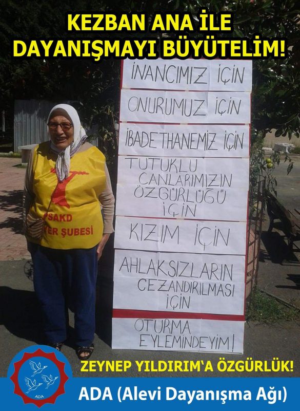 Polis tarafından gözaltına alınıp ardından çıkarıldığı mahkeme tarafından tutuklanan Küçük Armutlu Cemevi başkanı Zeynep Yıldırım annesi Kezban Ana, kızının ve daha önce tutuklanan damadı Haydar Yıldırım’ın serbest bırakılmaları için Cemevi’nin önünde oturma eyelemine başlamıştı. Bu yaşlı ama direngen anamız, tam 200 gündür oturma eylemimini sürdürüyor.