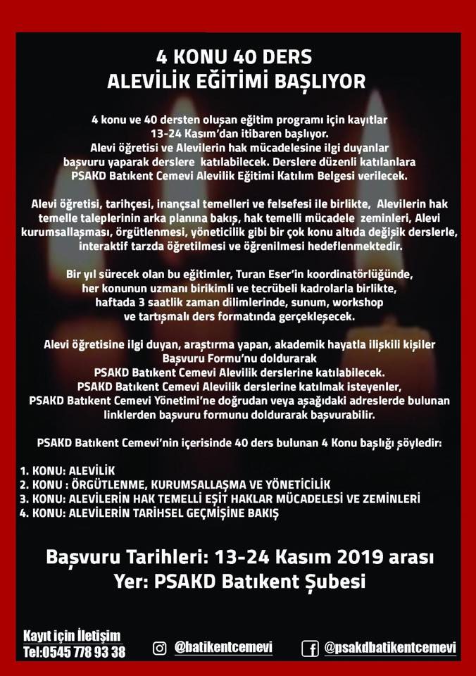 Batıkent PSAKD Cemevinde, gençler ve yetişkinler için; Turan Eser Koordinatörlüğünde 4 konu 40 ders Alevilik eğitimi başlıyor.
