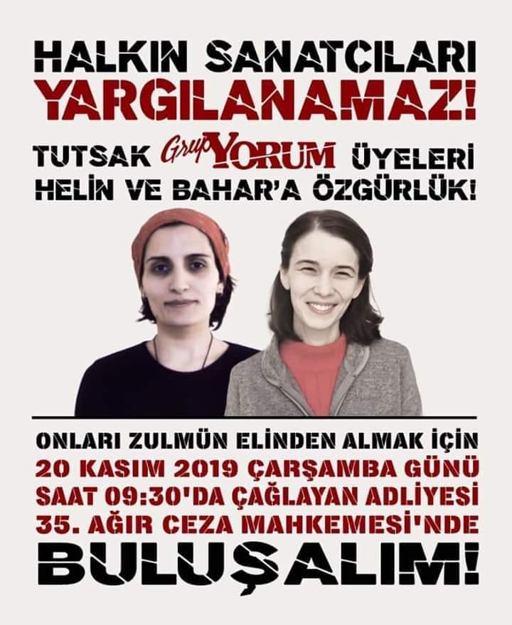 Grup Yorum üyeleri Helin Bölek ve Bahar Kurt’un yargılandığı davanın duruşması 20 Kasım günü saat 09.30’da Çağlayan Adliyesi 35. Ağır Ceza Mahkemesi’nde görülmeye devam edecek. Grup Yorum ve birçok demokratik kuruluş tarafından davaya katılarak açlık grevinde olan Yorum üyelerinin sahiplenmesi konusunda duyurular yapıldı. Bunların içinde tutsak Yorumcuların aileleri de yer almaktadır! Adalet istemiyle Grup Yorum üyeleri bugün 187 gündür açlık grevi eylemine devam etmektedir.