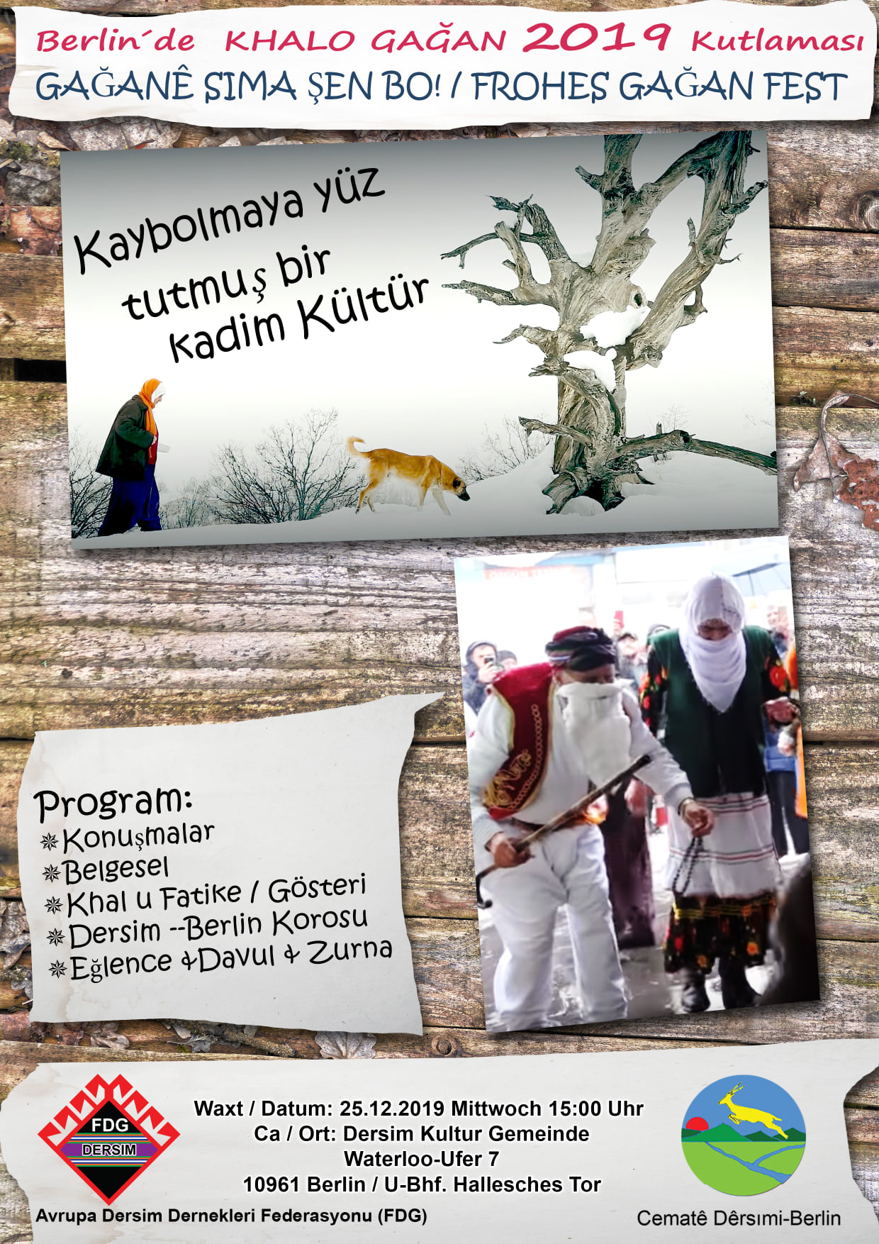 Geleneklere göre yeni yılın gelişi olarak kutlanan ‘Gağan’ etkinliklerini, Dersimliler her yıl Aralık ayının son haftas ile 13 Ocak tarihleri arasında düzenliyorlar. Avrupa Dersim Dernekleri Federasyonu (FDG) üyesi olan Berlin Dersim Kültür Cemaati kurulduğu 1993 yılından itibaren, düzenli olarak kutladığı Khal Gağan bu yılda kutlayacak. Bu yıl düzenleycekleri etkinliğe ilişkin yazılı bir açıklama yapan Berlin Dersim Kültür Cemaati, Dersimlileri ve dostların Khal Gağan etkinliğine katılmaya çağırdı: ” Sizler için müzikli Gağan kutlaması hazırladık, kültürümüzün bu geleneksel bayramını bu yılda birlikte kutlayalım. Cocuklarınız ile birlikte davetlisiniz. İsteyenler niyazını (lokmasını) getirebilir” dedi