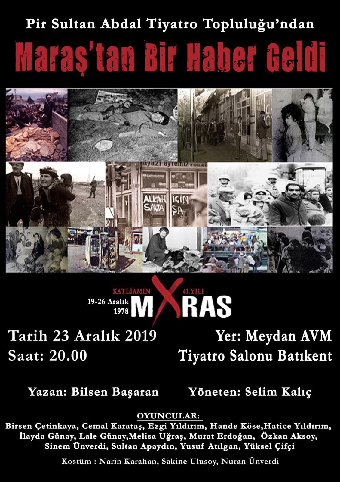 Batikent Pir Sultan Abdal Cemevi, Maraş Katliamı’nın 41. Yılında katliamda hayatların kaybeden mahsum insanları, Cemevi tiyatro topluluğunun sahneleyeceği oyunla anacak. Cemevi adına yapılan ‘‘Katliamın 41. Yılında Maraş’ı unutmadık, unutturmayacağız‘‘ başlıklı açıklamada düzenlenecek anmaya ilişkin sunlar ifade edildi: