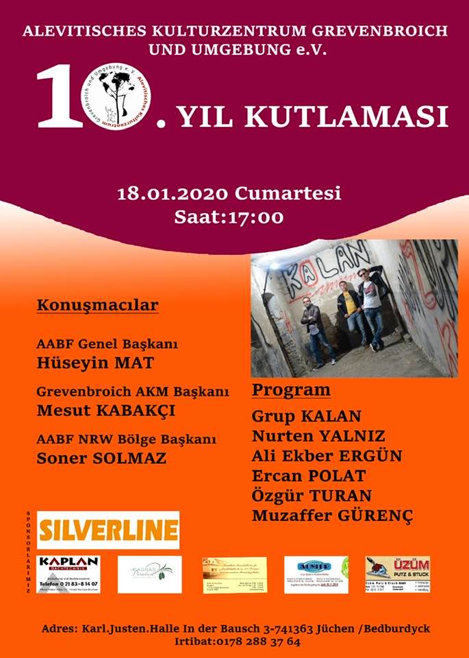 Grevenbroich Alevi Kültür Merkezi / Cemevi, 18 Ocak 2020 tarihinde, 10. Yılını kutlama şenliği düzenliyor. Karl -Justen Halle In der Bausch .3 / 741363 Jüchen / Bedburdyck / Grevenbroich adresinde düzenlenecek şenliğin çalışmaları yoğun bir şekilde devam ediyor. Saat: 17:00’de başlayacak şenlikte sanatçı Nurten Yalnız, Ali Ekber Ergün, Ercan Polat, Özgür Turan, Muzaffer Gürenç ve Grup Kalan sahne alacak.