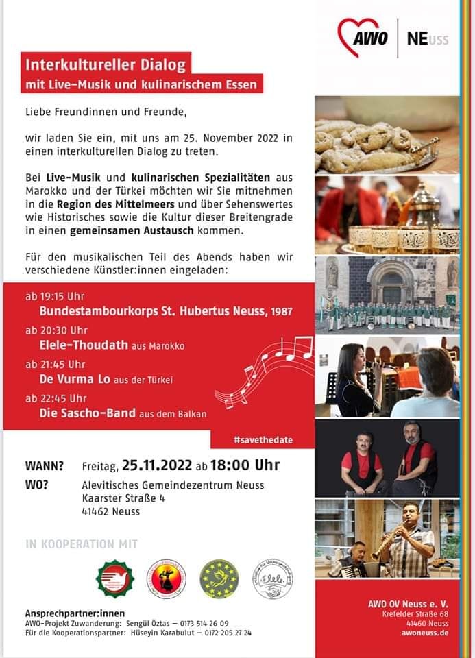 Neuss Alevi Toplumu, 25 Kasim'da " Külürlerarası Dialo Gecesi" düzenliyor. Neuss Alevi Toplumu Yöneti Kurulu įmzasıyla yaplan açıklamda, 25 Kasım'da...