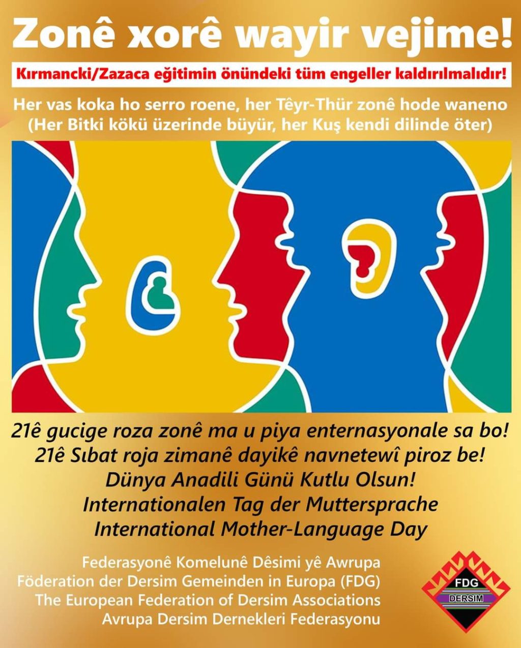 Avrupa Dersim Dernekleri Federasyonu (FDG), Dünya Anadı Günü dolayısıyla yazlı bir açıklama yaptı. "Dünya Anadil Günü Kutlu Olsun" başlıklı açıklamada,...