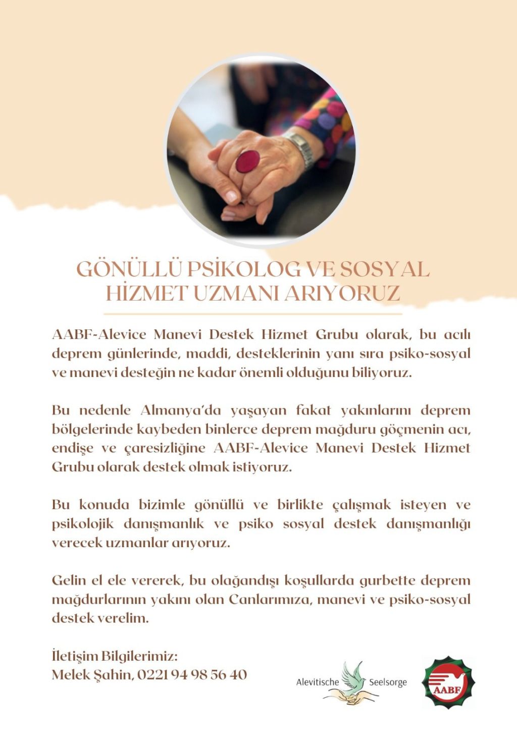 Almanya Alevi birlikleri Federasyonu ( AABF), sosyal medya üzerinden yaptığı yazlı açıklamada, gönüllü psikolog ve sosyal hizmet uzmanı aradığını duyurdu....