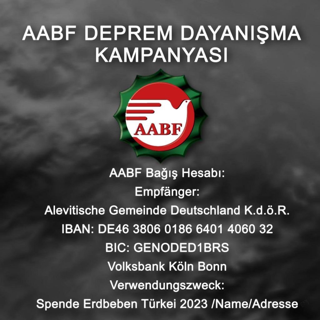 Almanya Alevi Birlikleri Federasyon (AABF) deprem için yardim kampanyası başlattı! " Yetiş Ya Hızır…" başlıkl açıklamada, şu ifadelere yer verildi:...