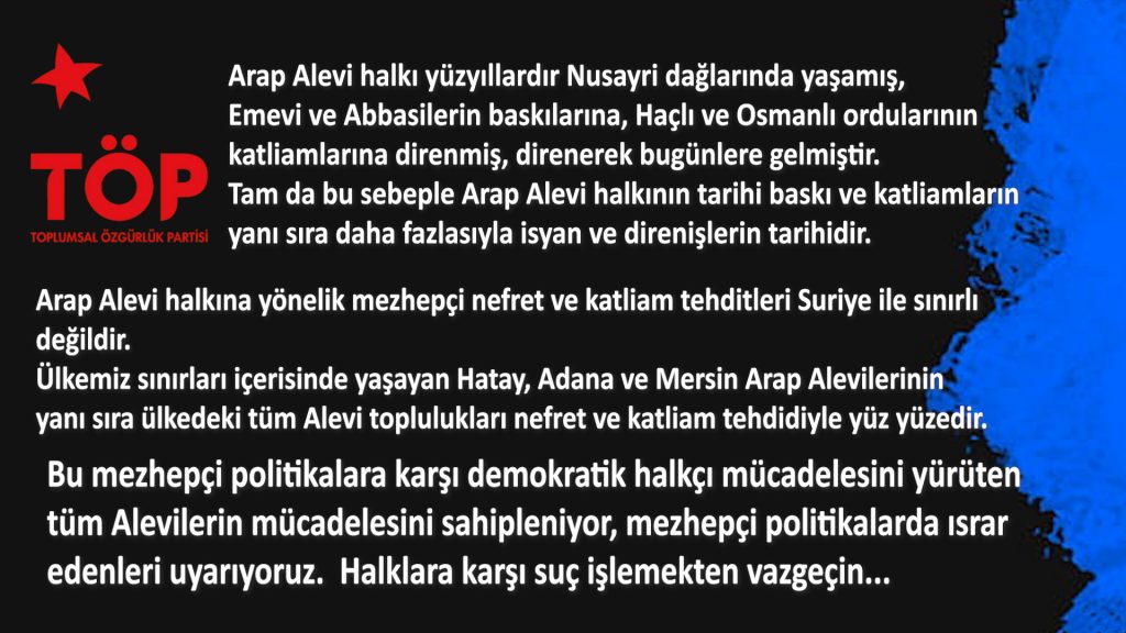 Toplumsal Özgürlük Partisi ( TÖP), cihatcı teröe şebeklerini Suriye'de Alevilere ve Alevileri inanç merkezlerine yönelik başlattıkları saldırılara ilişkin yazılı bir...