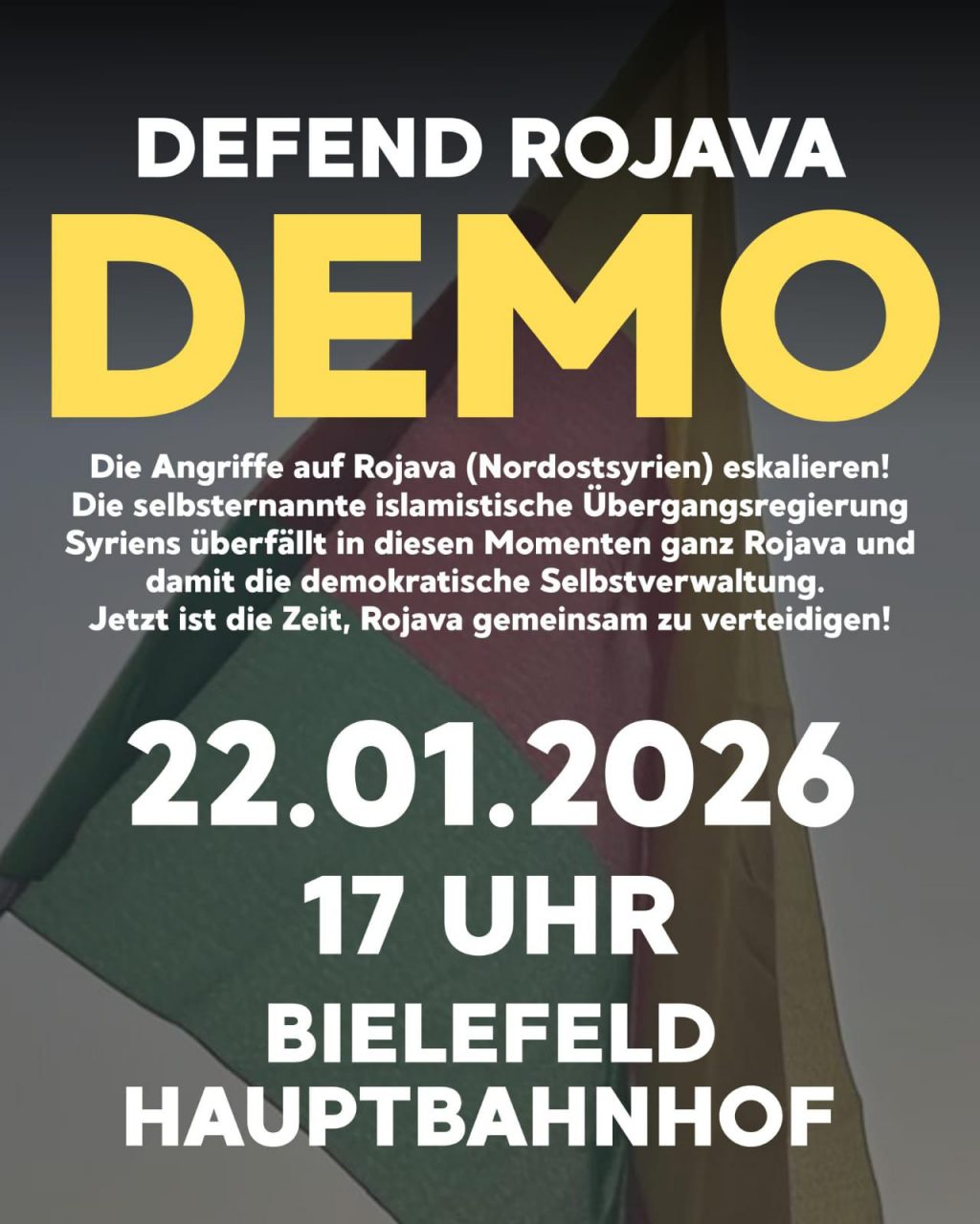 Almanya’nın Bielefeld kentinde, Suriye’nin kuzeyinde yer alan Rojava’ya yönelik saldırılara dikkat çekmek amacıyla bir gösteri düzenlenecek. “Defend Rojava” çağrısıyla yapılacak...