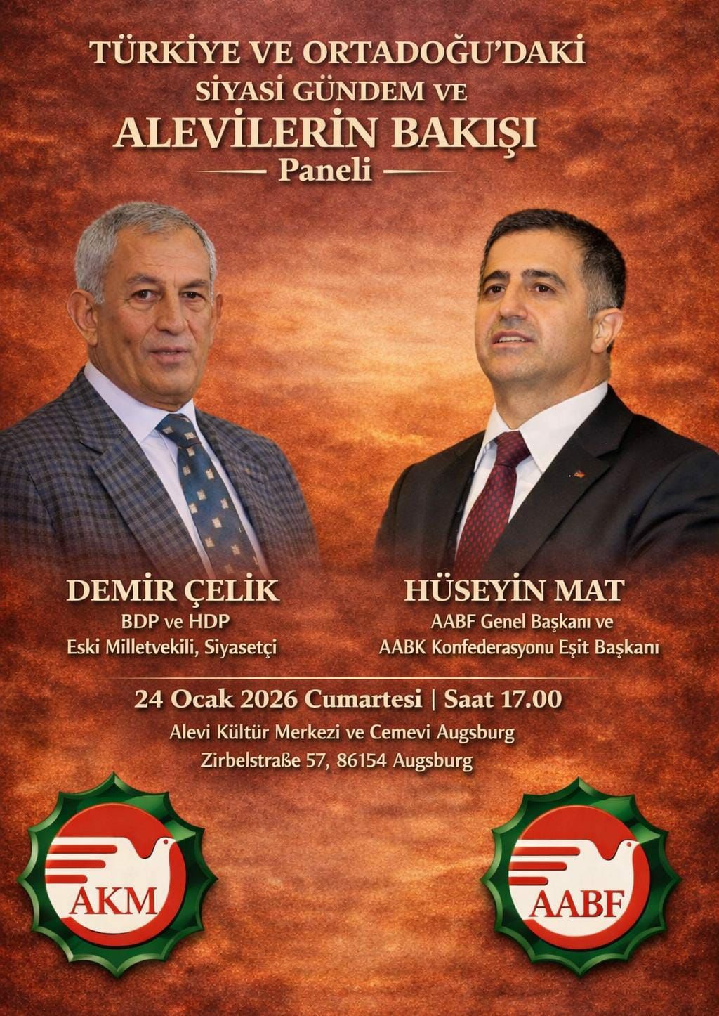 ⌈AHA⌉ Almanya’nın Augsburg kentinde, Türkiye ve Ortadoğu’da yaşanan güncel siyasal gelişmeler Alevilerin perspektifinden ele alınacak. “Türkiye ve Ortadoğu’daki Siyasi Gündem...