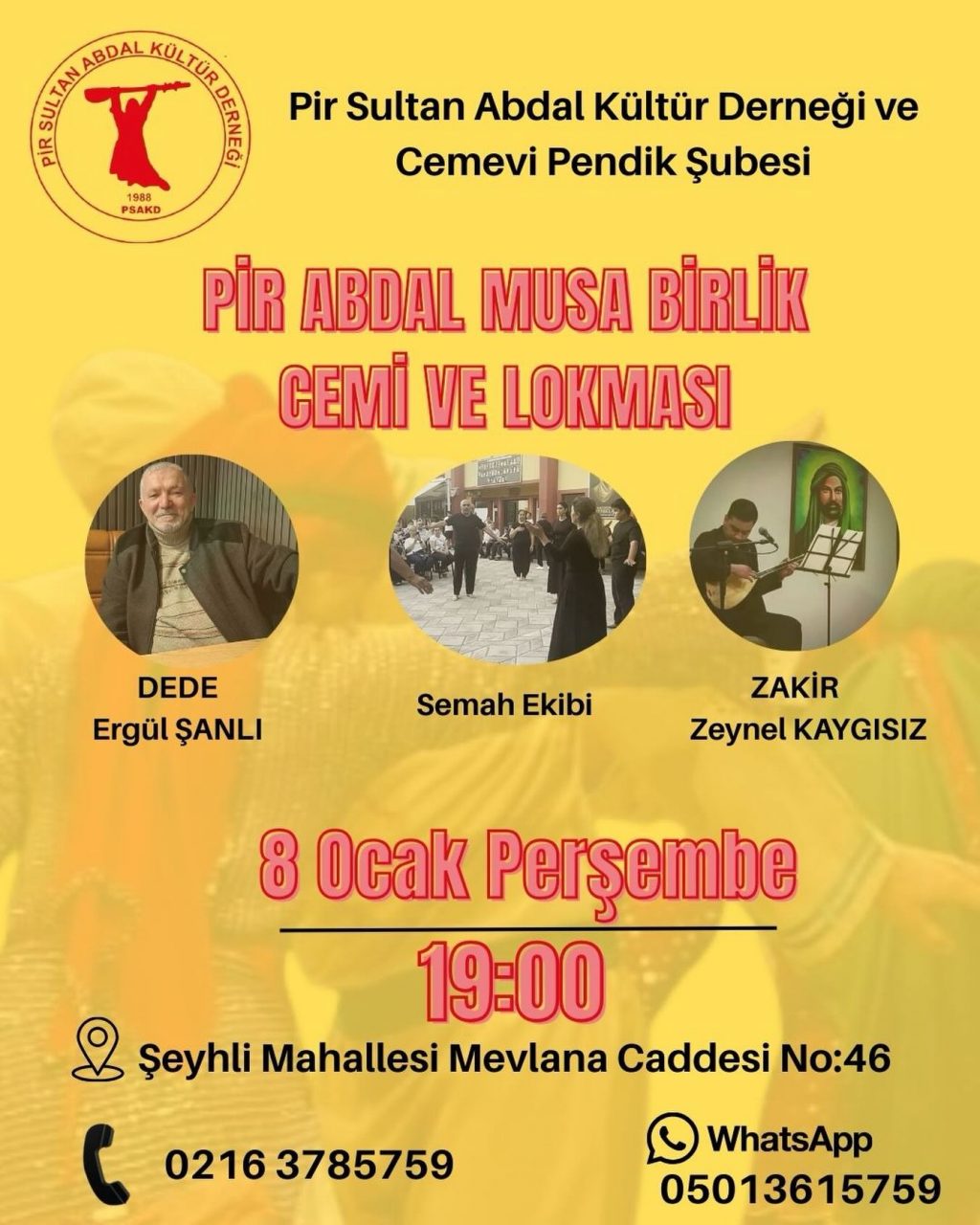 ⌈AHA⌉ Pir Sultan Abdal Kültür Derneği Pendik Şubesi tarafından Pir Abdal Musa Birlik Cemi erkânı düzenlenecek. 8 Ocak Perşembe günü...