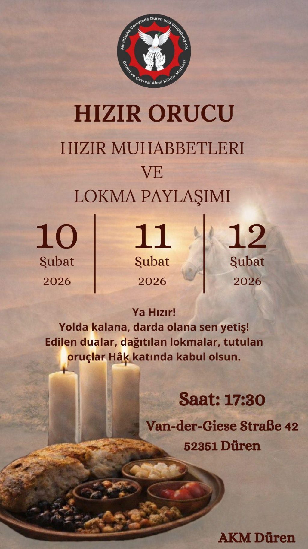 ⌈AHA⌉ Düren ve Çevresi Alevi Kültür Merkezi (AKM Düren) tarafından Hızır ayı vesilesiyle Hızır Orucu, Hızır Muhabbetleri ve lokma paylaşımı...