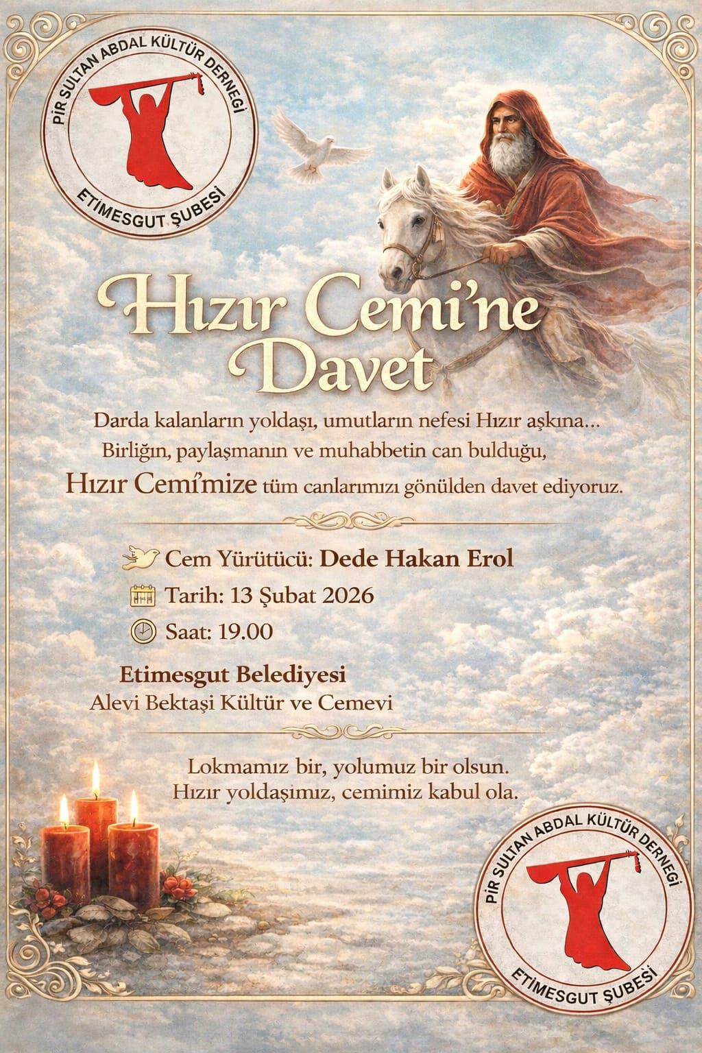 ⌈AHA⌉ Pir Sultan Abdal Kültür Derneği Etimesgut Şubesi, Hızır ayı vesilesiyle düzenlenecek Hızır Cemi için canlara çağrıda bulundu. Yapılan açıklamada,...