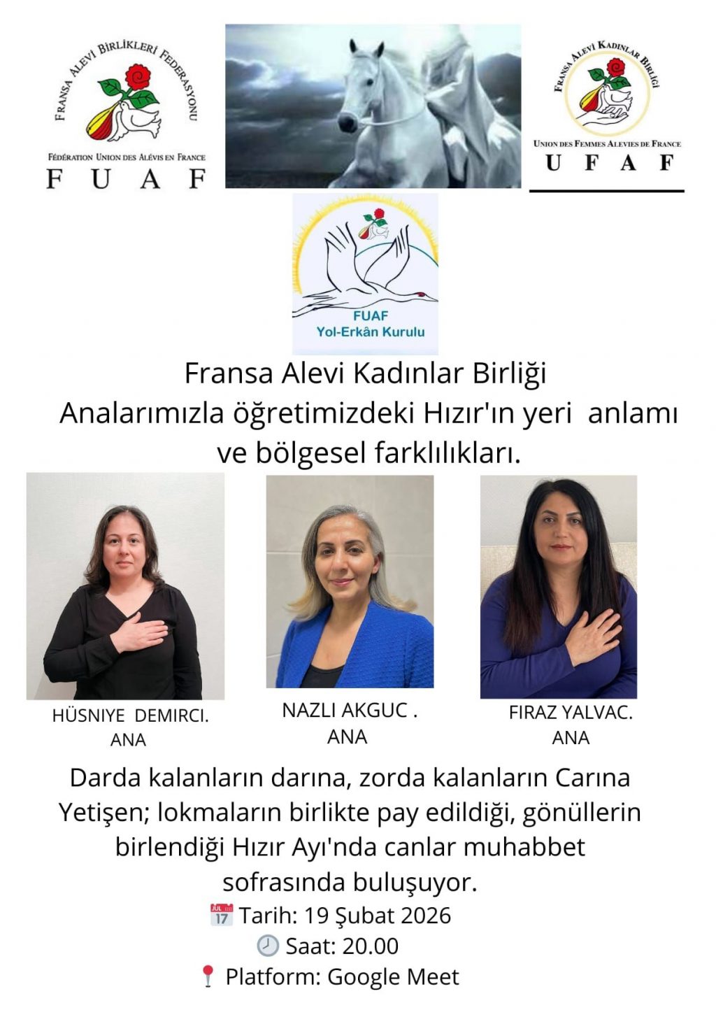 ⌈AHA⌉ Fransa Alevi Kadınlar Birliği, Hızır Ayı dolayısıyla yazılı bir mesaj yayımladı. Açıklamada, Hızır’ın Alevi inancındaki anlamına ve toplumsal dayanışma...