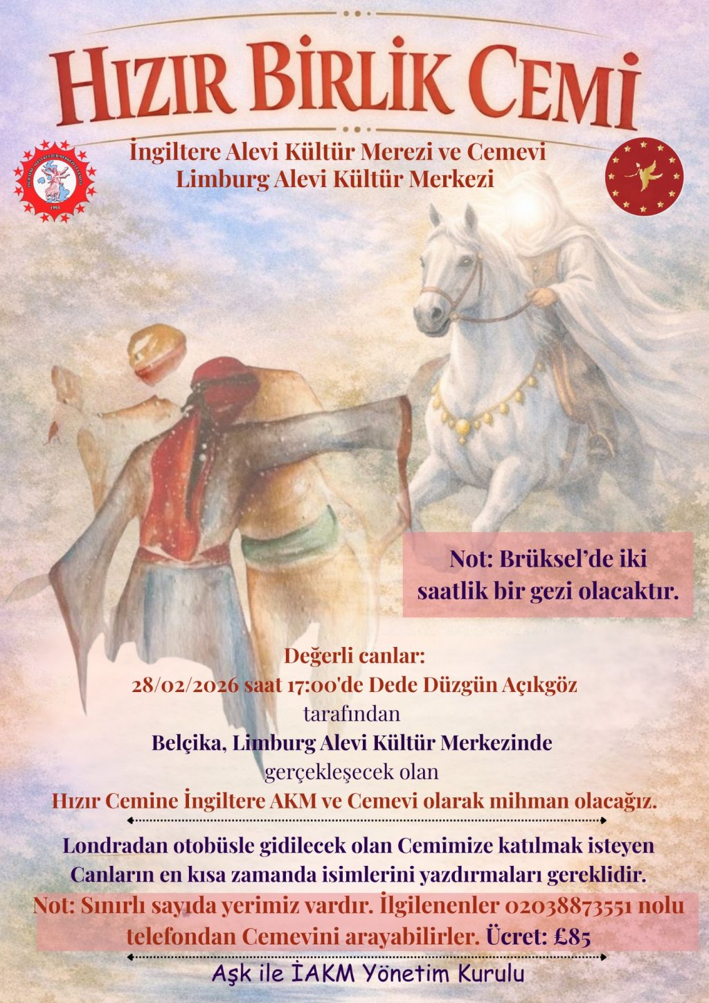 ⌈AHA⌉ İngiltere Alevi Kültür Merkezi ve Cemevi, 28 Şubat 2026 tarihinde Belçika’da düzenlenecek Hızır Birlik Cemi’ne katılacak. Cem, Limburg Alevi...