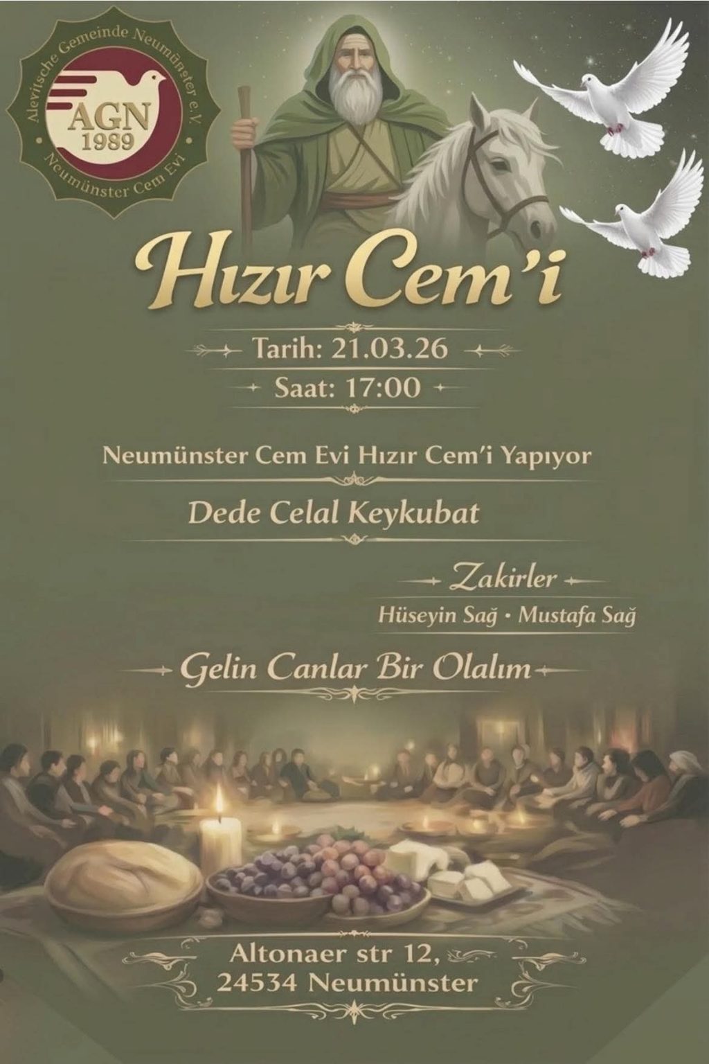 ⌈AHA⌉ Almanya’nın Neumünster kentinde faaliyet yürüten Neumünster Cem Evi, Hızır Cemi düzenleyeceğini duyurdu. Alevi inancında dayanışma, birlik ve paylaşmanın simgesi...