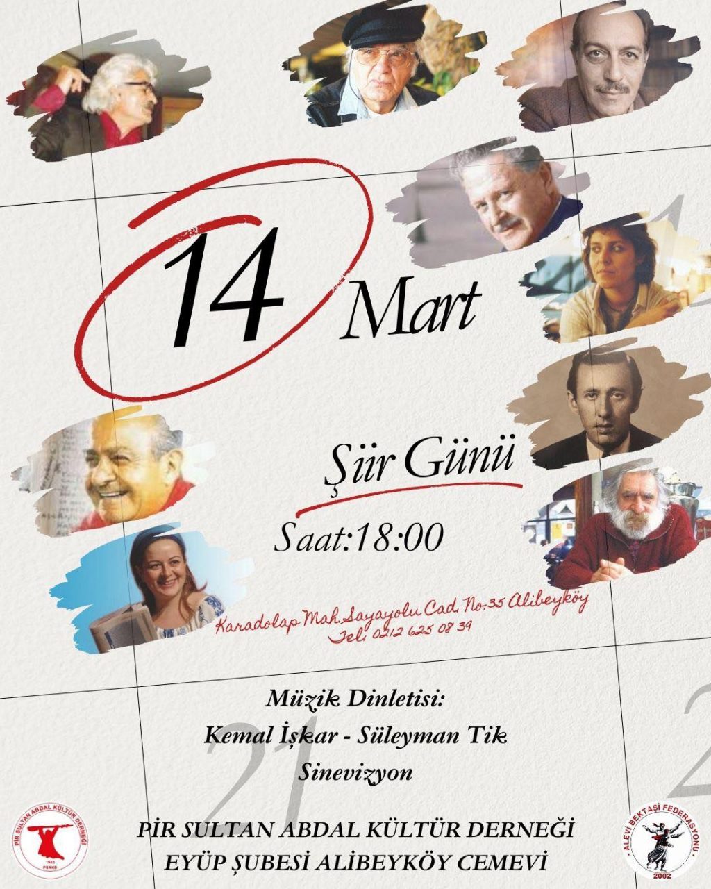 ⌈AHA⌉ Pir Sultan Abdal Kültür Derneği Eyüp Şubesi, 14 Mart’ta düzenleyeceği “Şiir Günü” etkinliğiyle şiir severleri bir araya getirmeye hazırlanıyor....