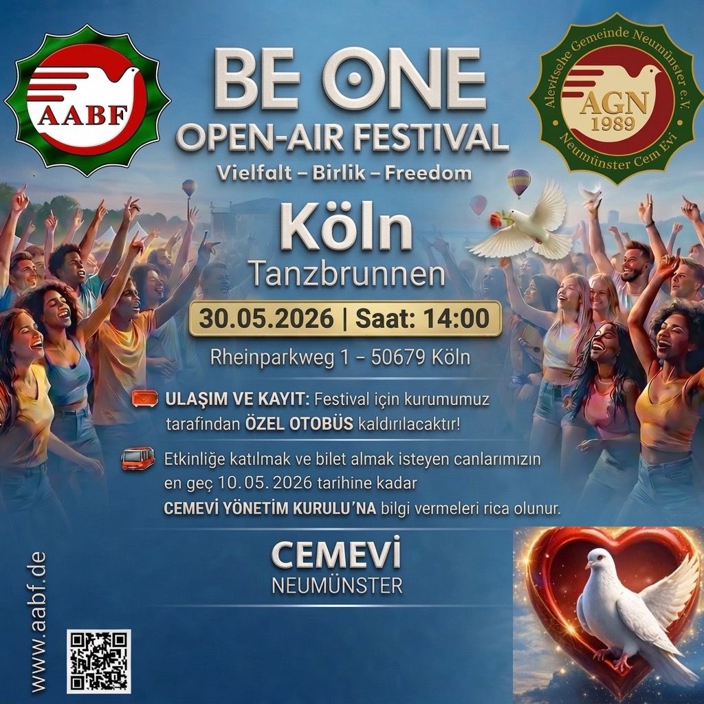 ⌈AHA⌉ Almanya’da faaliyet yürüten Neumünster Cemevi, 30 Mayıs 2026 tarihinde Köln’de düzenlenecek BE ONE Open-Air Festival için katılım çağrısında bulundu....