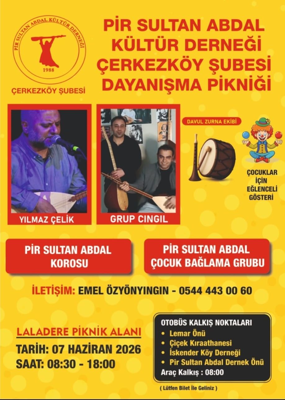 ⌈AHA⌉ Pir Sultan Abdal Kültür Derneği Çerkezköy Şubesi tarafından düzenlenen dayanışma pikniği, 7 Haziran 2026 tarihinde geniş katılımla gerçekleştirilecek. Laladere...