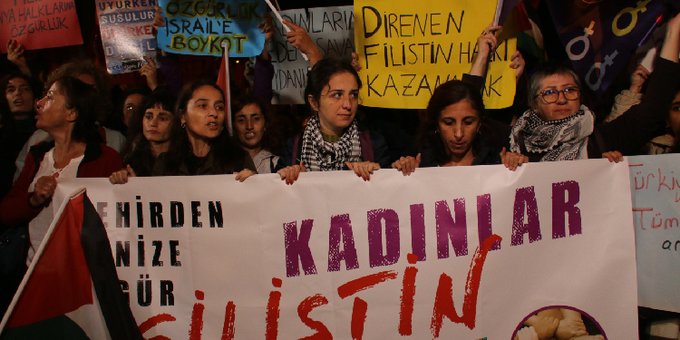Kadınlar Birlikte Güçlü, İsrail'in Filistin'e yönelik saldırılarını yürüyüşle protesto ederek, “Filistin’de savaşa hayır, ama Rojava'da, Karabağ’da evet diyen bu ikiyüzlülüğe...