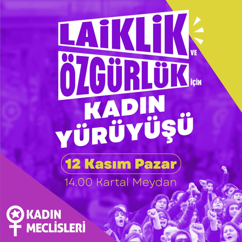 Kadınlar, 12 Kasım Pazar günü, saat 14:00’te İstanbul Kartal’da Laiklik ve Özgürlük için Kadın Yürüyüşü'nde buluşacaklar. ''Kadınlar Laiklik ve Özgürlük...
