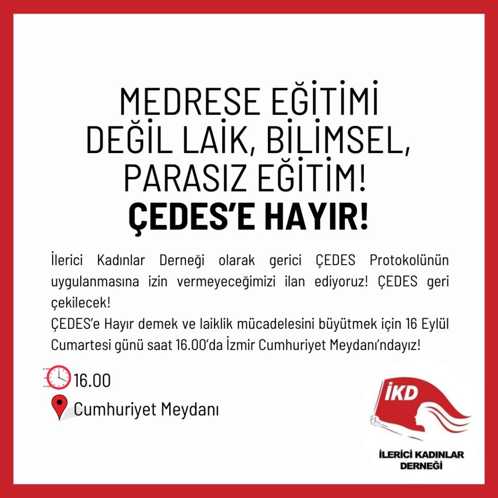 İlerici Kadunlar Derneği ( İKD), yazılı bir açıklama yaparak Alevi kurumları, Eğitim Sen ve Veli- Der'in 16 Eylül'de '' Laik...