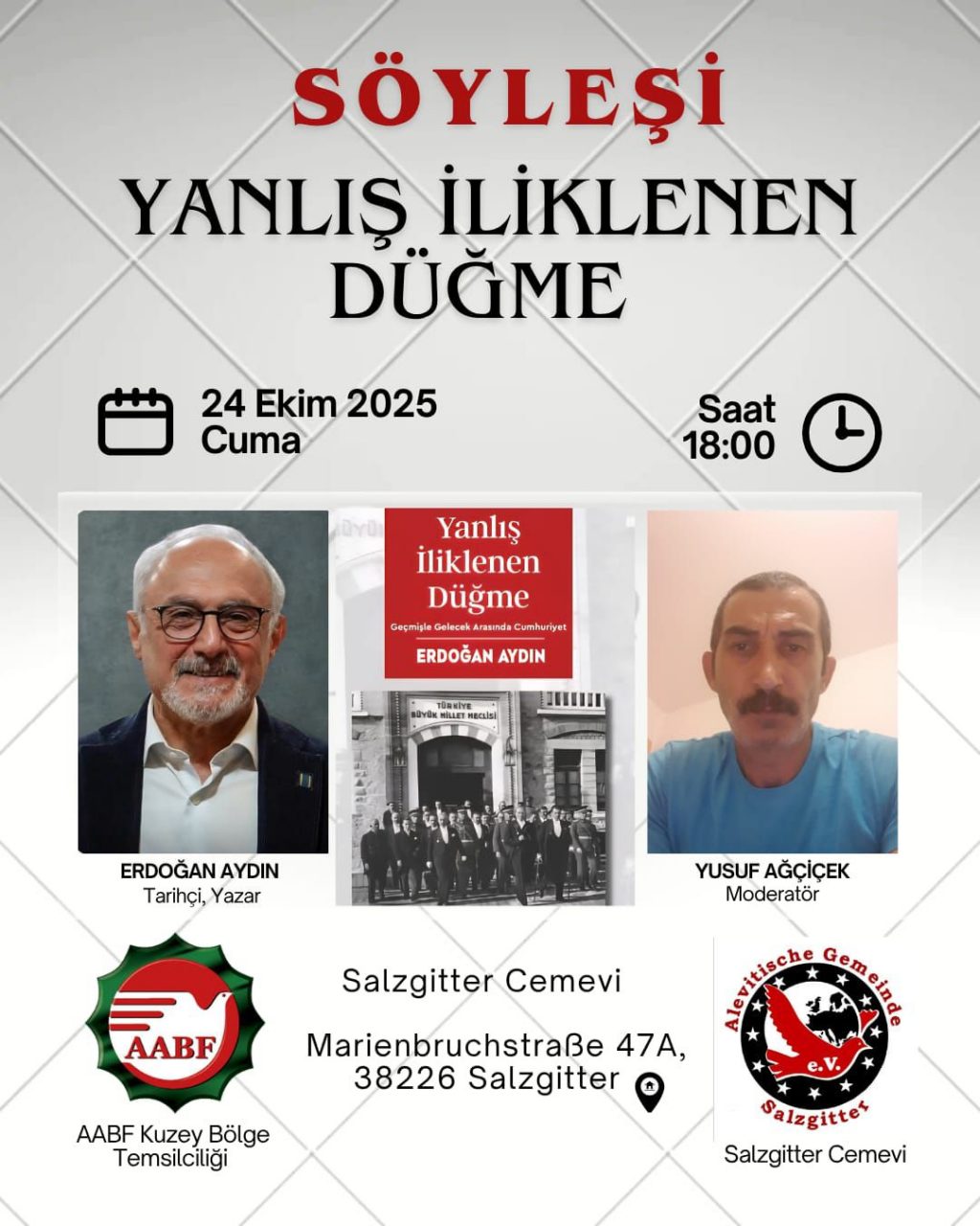 Alevitische Gemeinde Salzgitter (Salzgitter Alevi Toplumu) tarafından düzenlenen söyleşide yazar ve tarihçi Erdoğan Aydın, son kitabı “Yanlış İliklenen Düğme –...