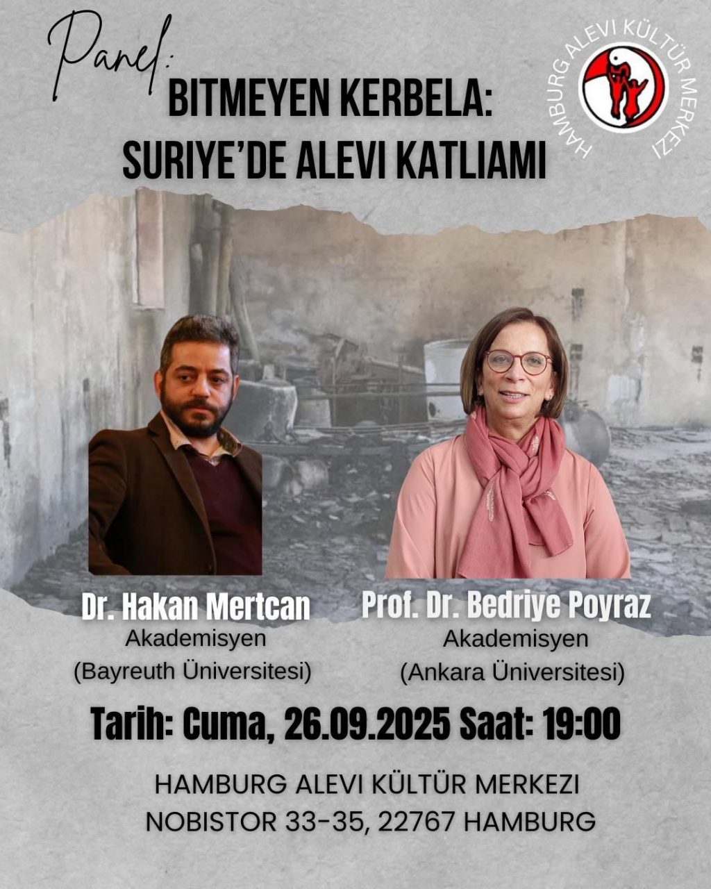 Prof. Dr. Bedriye Poyraz Ve Dr. Hakan Mertcan Konuşmacı OlacakHamburg Alevi Kültür Merkezi, “Bitmeyen Kerbela: Suriye’de Alevi Katliamı” başlıklı önemli...