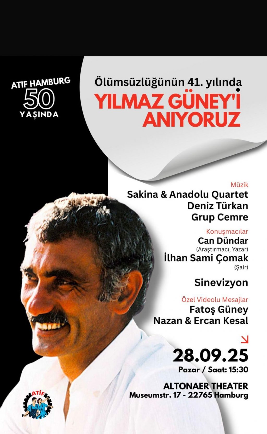 ⌈Haber Merkezi⌉ Avrupa Türkiyeli İşçiler Konfederasyonu (ATİF) Hamburg, kuruluşunun 50. yılında unutulmaz sinemacı Yılmaz Güney için anma etkinliği düzenliyor. Müzik...