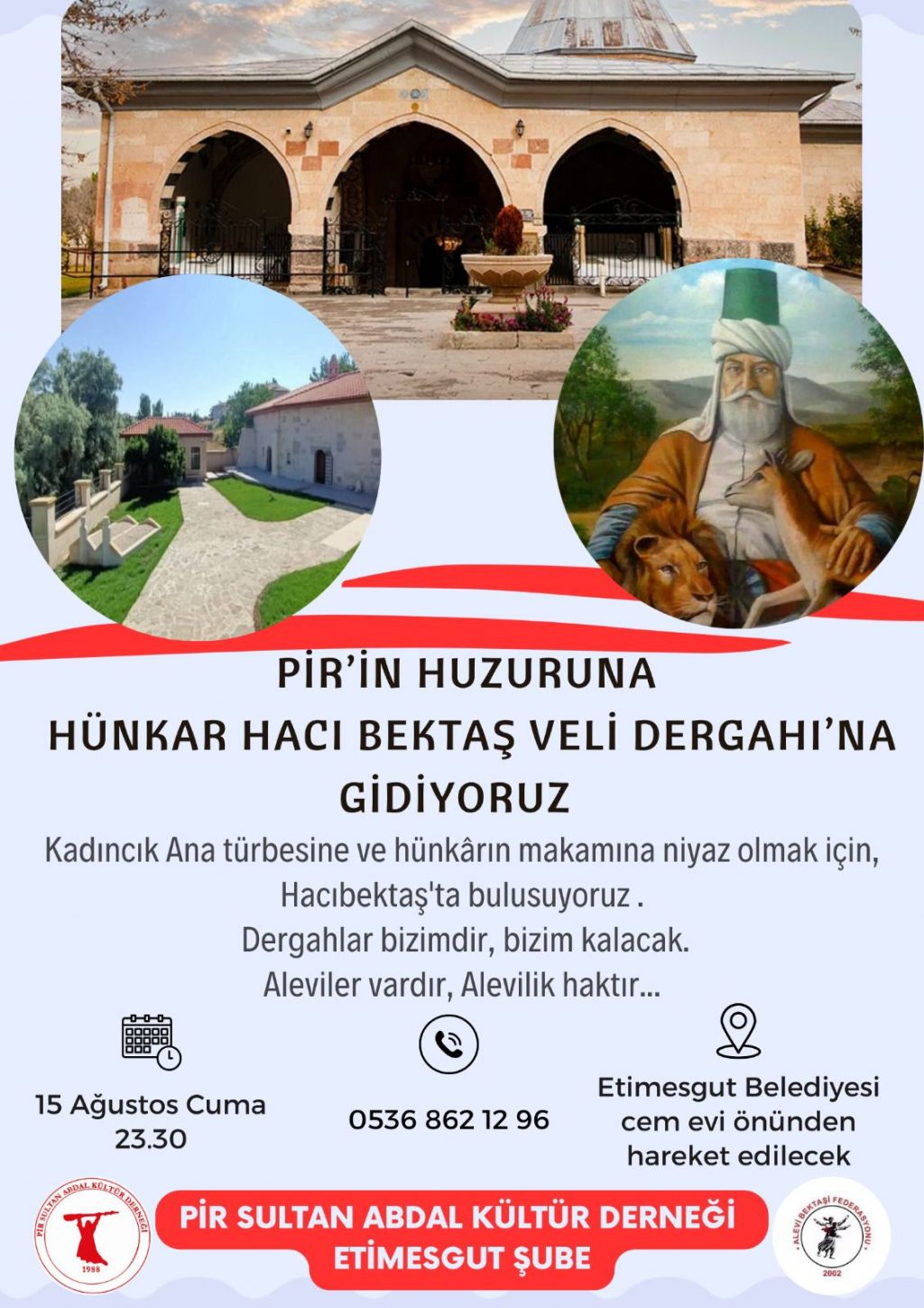 Hacıbektaş’ta Pir’in Huzuruna YolculukPir Sultan Abdal Kültür Derneği (PSAKD) Etimesgut Şubesi, 15 Ağustos Cuma gecesi Hacıbektaş’a hareket edeceklerini duyurdu. Kadıncık...