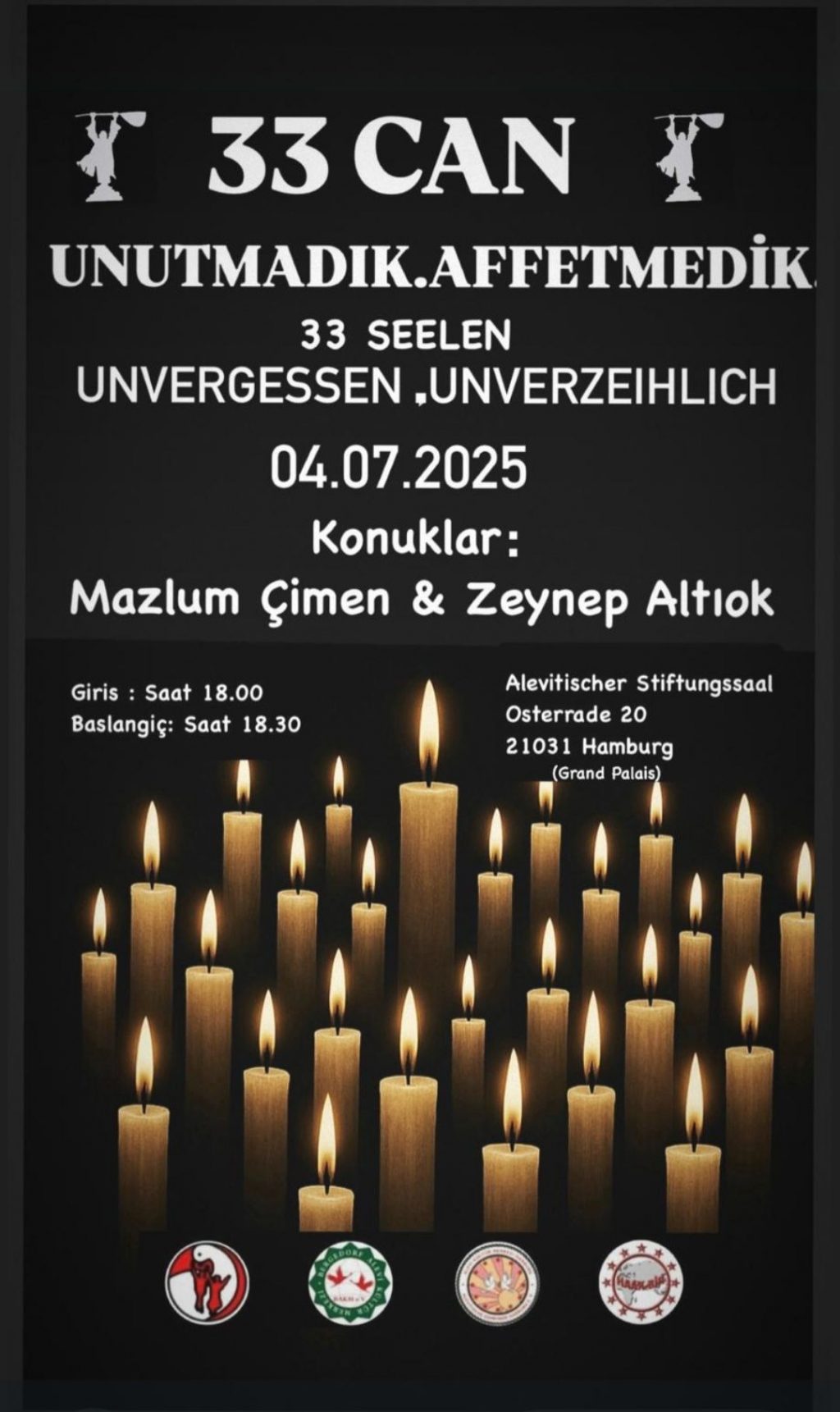 Hamburg’daki dört Alevi kurumu, 2 Temmuz 1993’te Sivas Madımak Oteli’nde yakılarak katledilen 33 canı birlikte düzenleyecekleri bir etkinlikle anacak. Sivas...