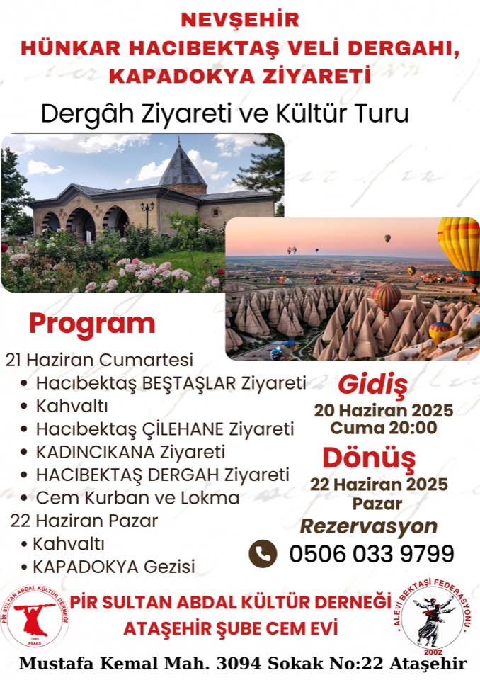 Haber Merekzi - Pir Sultan Abdal Kültür Derneği (PSAKD) Ataşehir Şubesi, 20-22 Haziran 2025 tarihleri arasında Hacıbektaş Veli Dergâhı ziyareti...