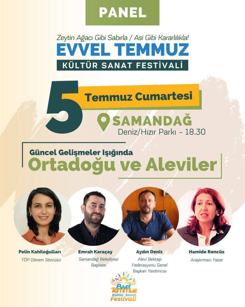 Samandağ’da düzenlenen Evvel Temmuz Kültür Sanat Festivali kapsamında, 5 Temmuz Cumartesi günü “Güncel Gelişmeler Işığında Ortadoğu ve Aleviler” başlıklı bir...