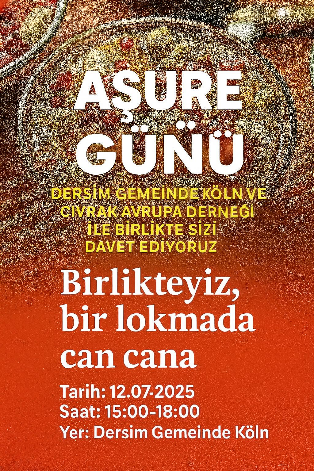 ⌈Haber Merekzi⌉ Dersim Gemeinde Köln ile Cıvrak Avrupa Derneği, 12 Temmuz 2025 Cumartesi günü Aşure Günü dolayısıyla bir araya geliyor....