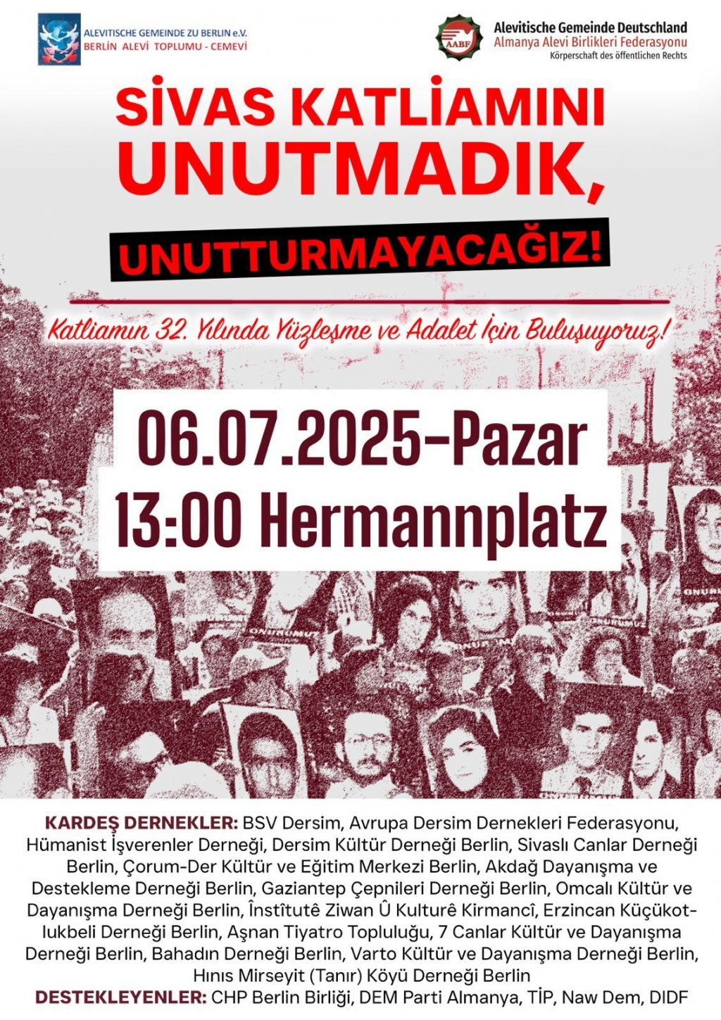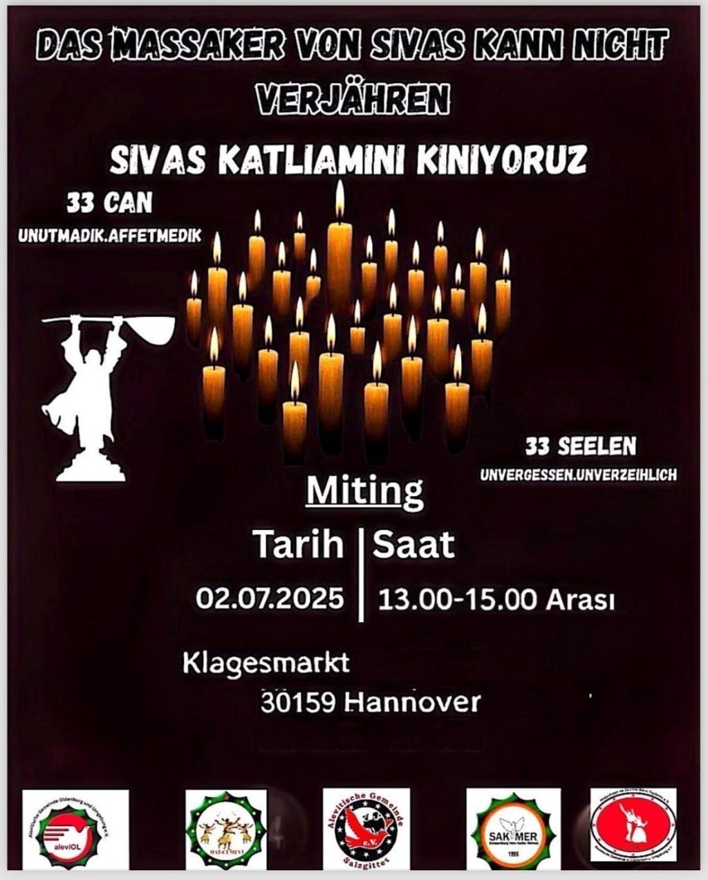 ⌈Haber Merkezi⌉ Sivas Katliamı’nın 32. yılı dolayısıyla Berlin’de kitlesel bir anma mitingi düzenleniyor. Berlin Alevi Toplumu – Cemevi ve Almanya...