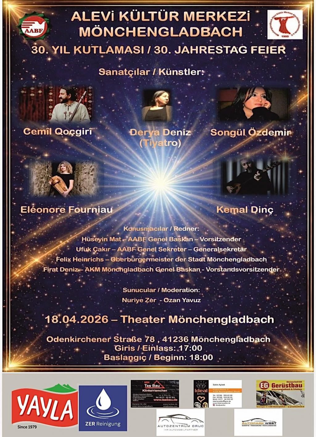 ⌈AHA⌉ Almanya’nın Mönchengladbach kentinde faaliyet gösteren Alevi Kültür Merkezi, kuruluşunun 30. yılını kapsamlı bir etkinlikle kutlamaya hazırlanıyor. 18 Nisan 2026...