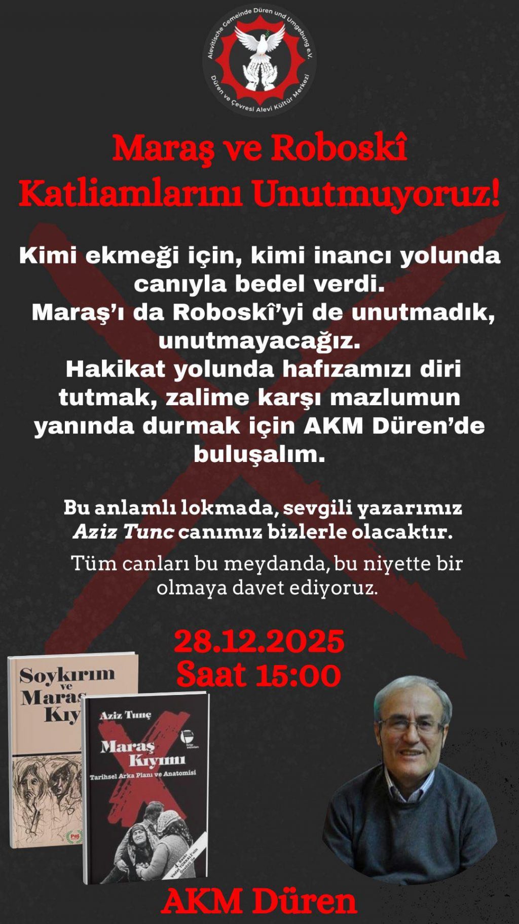 ⌈Haber Merkezi⌉ Maraş ve Roboskî katliamları, Almanya’nın Düren kentinde düzenlenecek bir etkinlikle anılacak. Düren ve Çevresi Alevi Kültür Merkezi (AKM...