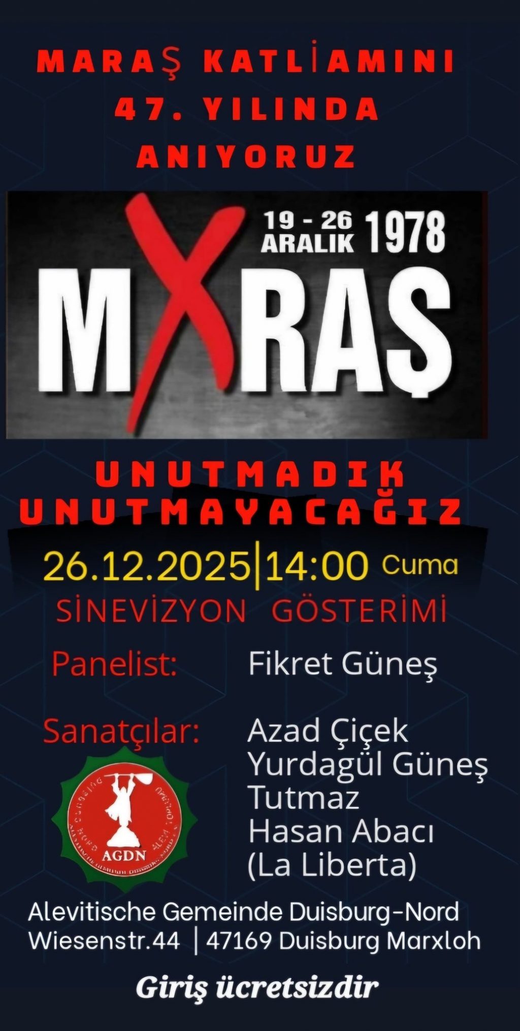⌈Haber Merkezi⌉ Maraş’ta 19–26 Aralık 1978 tarihlerinde yaşanan ve Alevi toplumunun hafızasında derin yaralar bırakan Maraş Katliamı, 47. yılında Almanya’nın Duisburg...