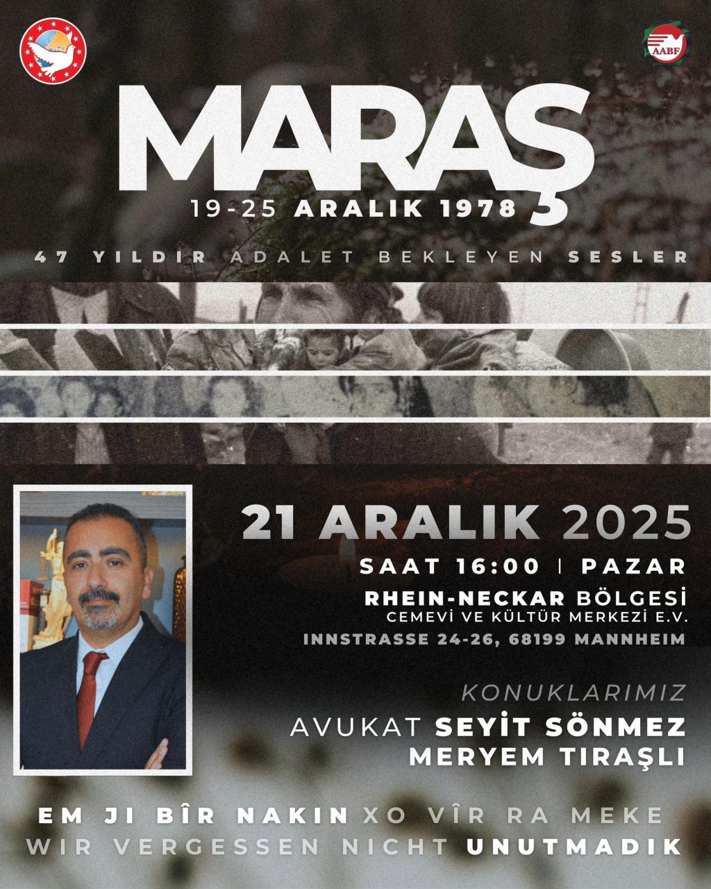 19–25 Aralık 1978 tarihlerinde yaşanan Maraş Katliamı’nın 47. yılı dolayısıyla Almanya’nın Mannheim kentinde anma etkinliği düzenlenecek. “47 yıldır adalet bekleyen...