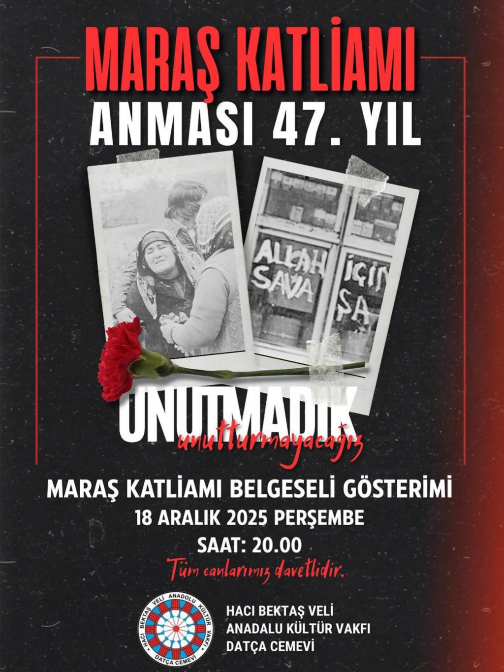 ⌈Haber Merkezi⌉ Hacı Bektaş Veli Anadolu Kültür Vakfı Datça Şubesi Cemevi’nde, Maraş Katliamı’nın 47. yılı dolayısıyla belgesel gösterimi gerçekleştirilecek. Her...