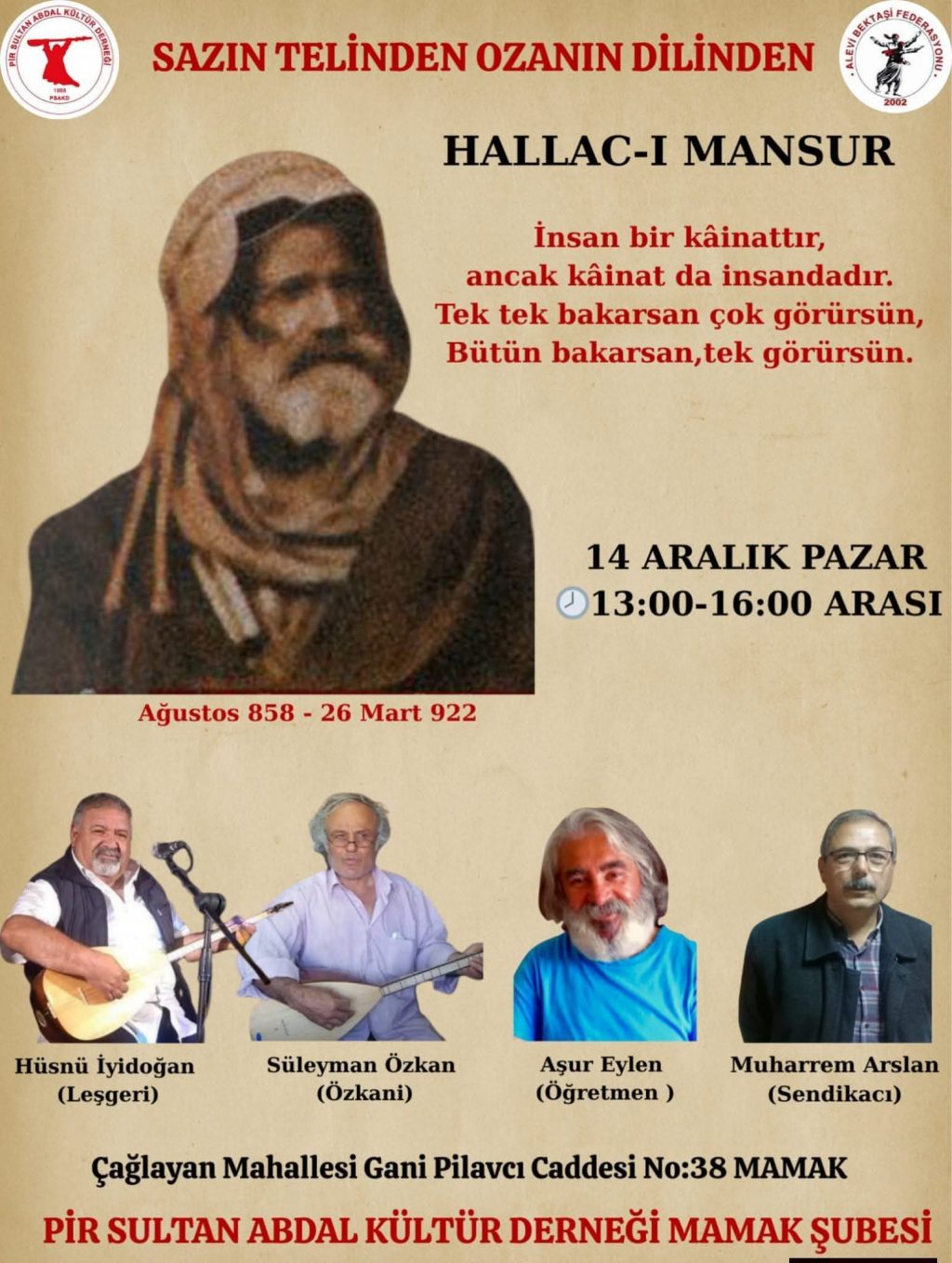 PİR Sultan Abdal Kültür Derneği Mamak Şubesi, Hallâc-ı Mansûr’un düşüncesini, direnişini ve hakikat arayışını merkeze alan anlamlı bir etkinlik düzenliyor....