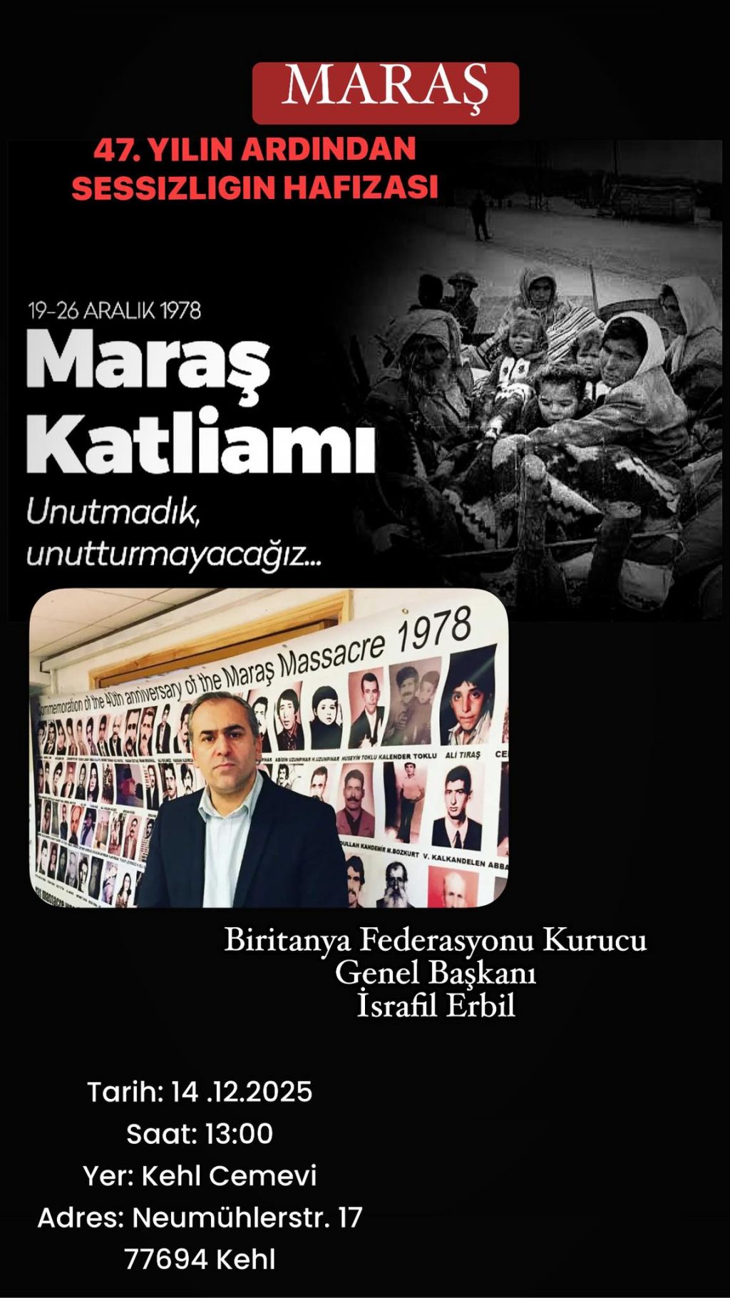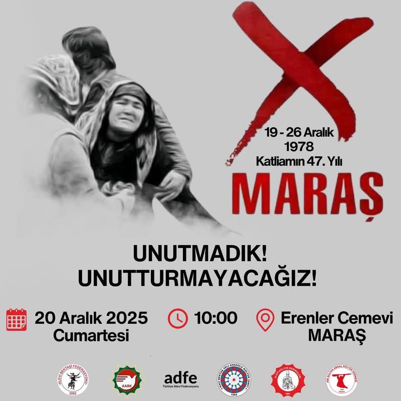 ⌈Haber Merkezi⌉ Maraş’ta 19–26 Aralık 1978 tarihlerinde yaşanan ve onlarca Alevi yurttaşın katledildiği Maraş Katliamı, 47. yılında Almanya’nın Kehl kentinde...