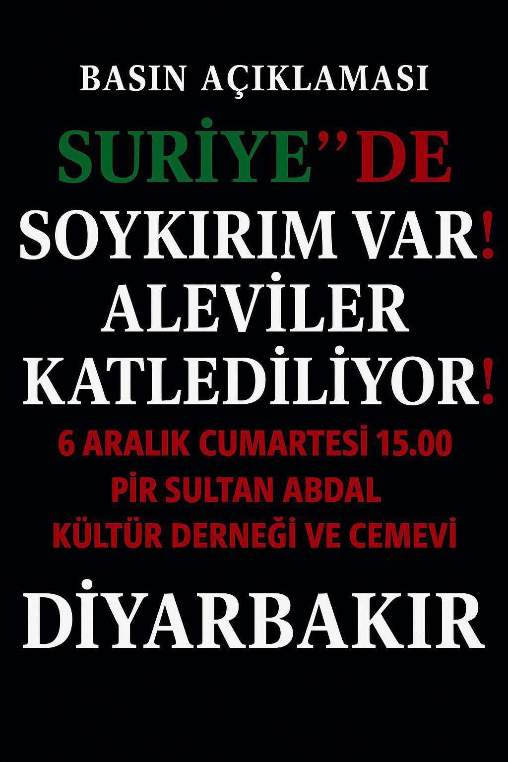 ⌈Haber Merkezi⌉ Suriye’de Alevilere yönelik katliamlara dikkat çekmek amacıyla Diyarbakır’da basın açıklaması düzenlenecek. “Suriye’de soykırım var, Aleviler katlediliyor” sloganıyla yapılacak...