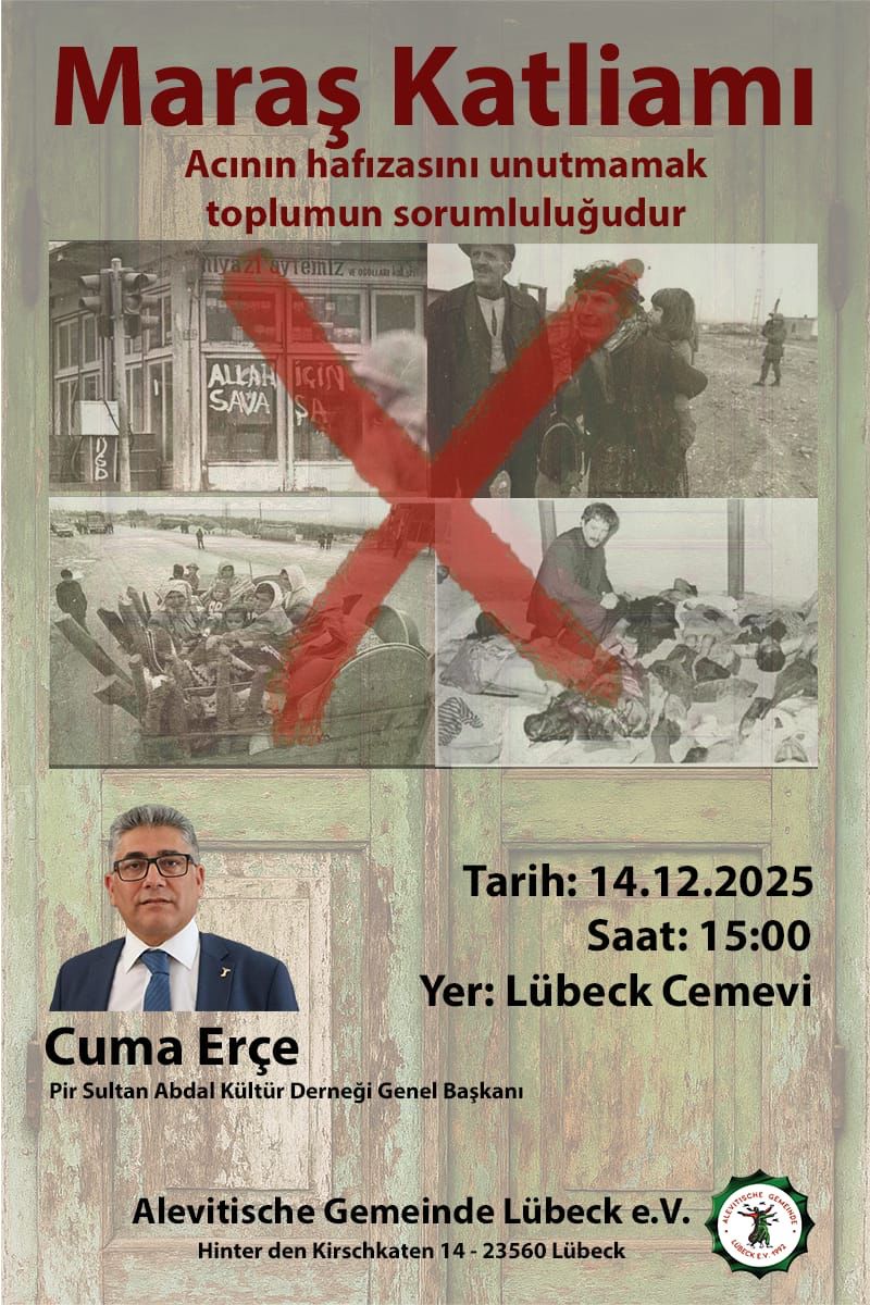 ⌈Haber Merkezi⌉ Maraş Katliamı’nın acısını, yarasını ve toplumsal hafızasını diri tutmak amacıyla Almanya’nın Lübeck kentinde anma programı düzenleniyor. Alevitische Gemeinde...