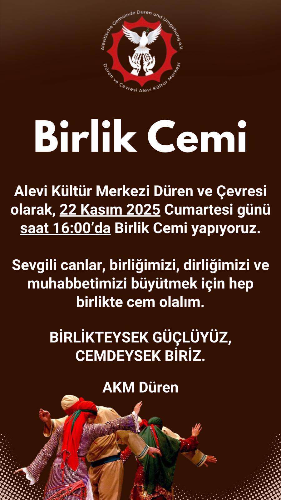 ⌈Haber Merkezi⌉ Alevi Kültür Merkezi Düren ve Çevresi, 22 Kasım 2025 Cumartesi günü saat 16.00’da Birlik Cemi gerçekleştirecek. Cem, Alevi...