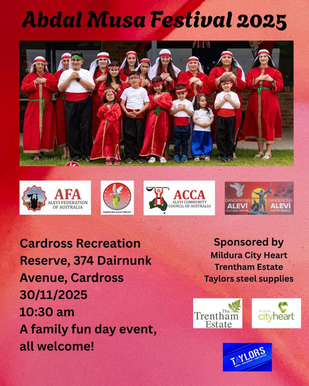 Alevi Federasyonu Avustralya (AFA) öncülüğünde, Avustralya’daki Alevi kurumlarının ortaklaşa düzenlediği Abdal Musa Festivali, bu yıl Mildura’da geniş bir katılımla gerçekleştirilecek....
